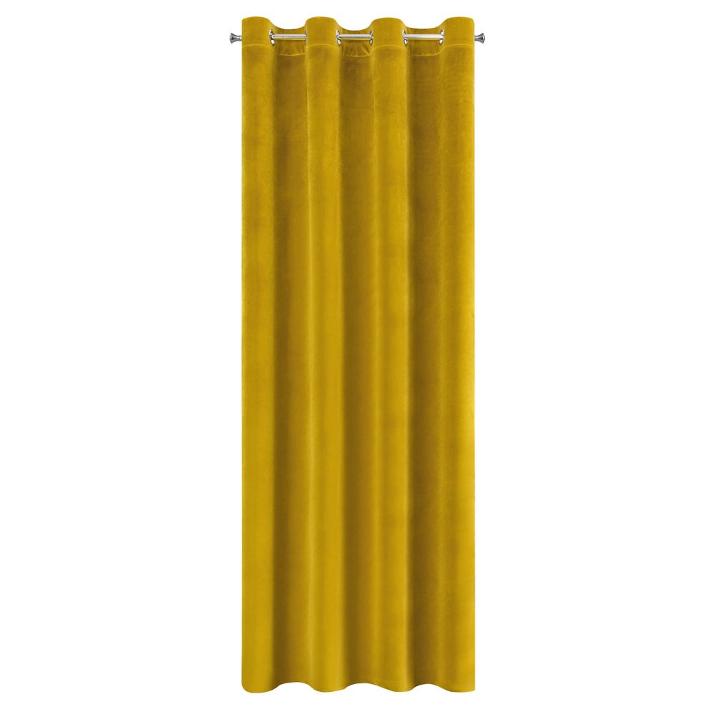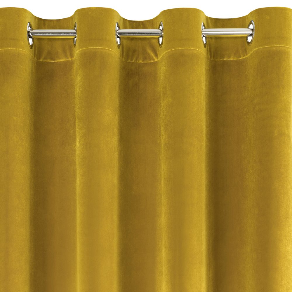 Lekka, welwetowa zasłona z miękkiej tkaniny o subtelnym połysku, charakterystycznym dla welwetów. Miękko się układa. Prasować na lewą stronę. szerokość: 140 cm, długość: 250 cm, kolor: musztardowy, Gramatura: 190 GSM, Skład: 100% poliester