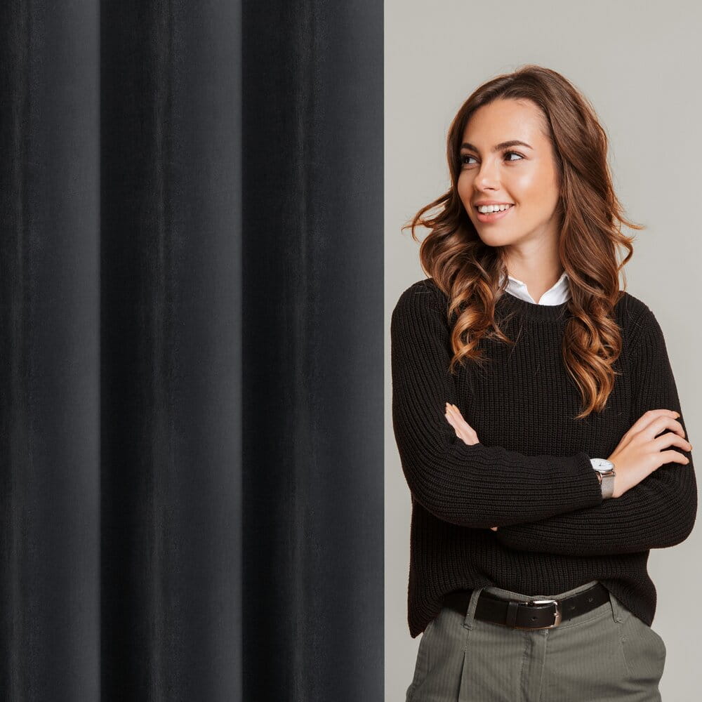 Zasłona welwetowa 100% zaciemniająca szerokość: 140 cm, długość: 250 cm, kolor: czarny, Gramatura: 200 GSM, Skład: przód: 100% poliester: tył: 98% akryl, 2% poliester