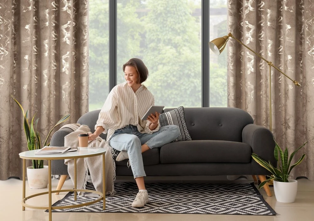 Welwetowa zasłona gotowa z nadrukiem błyszczącym szerokość: 140 cm, długość: 270 cm, kolor: brązowy, Gramatura: 200 GSM, Skład: 100% poliester