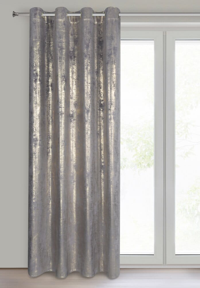 Zasłona gotowa welwetowa z błyszczącym nadrukiem szerokość: 140 cm, długość: 250 cm, kolor: stalowy, Gramatura: 200 GSM, Skład: 100% poliester