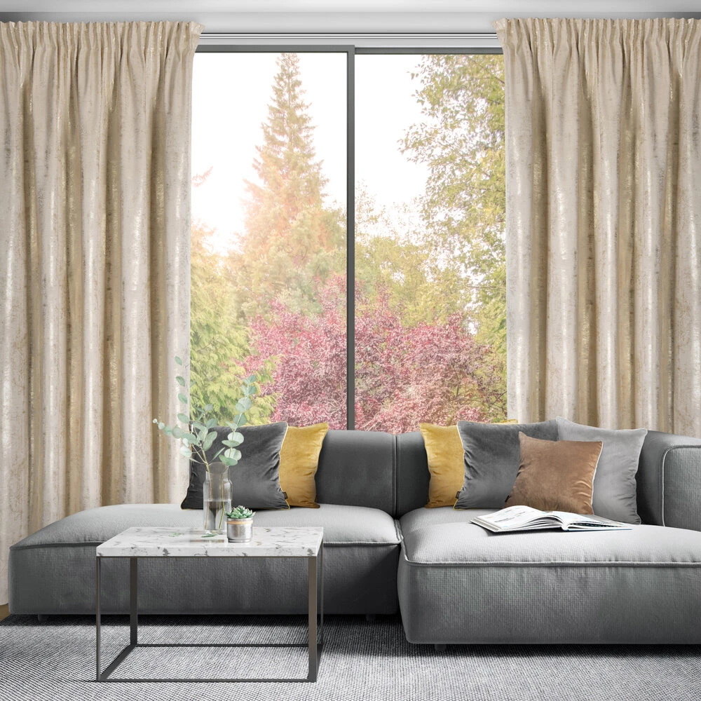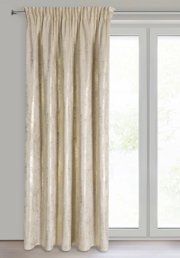 Zasłona gotowa welwetowa z błyszczącym nadrukiem szerokość: 140 cm, długość: 270 cm, kolor: jasnobeżowy, Gramatura: 200 GSM, Skład: 100% poliester
