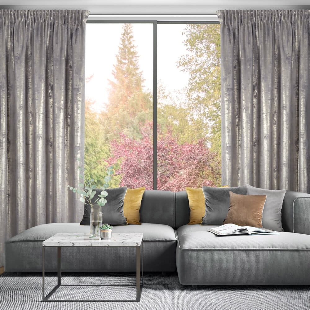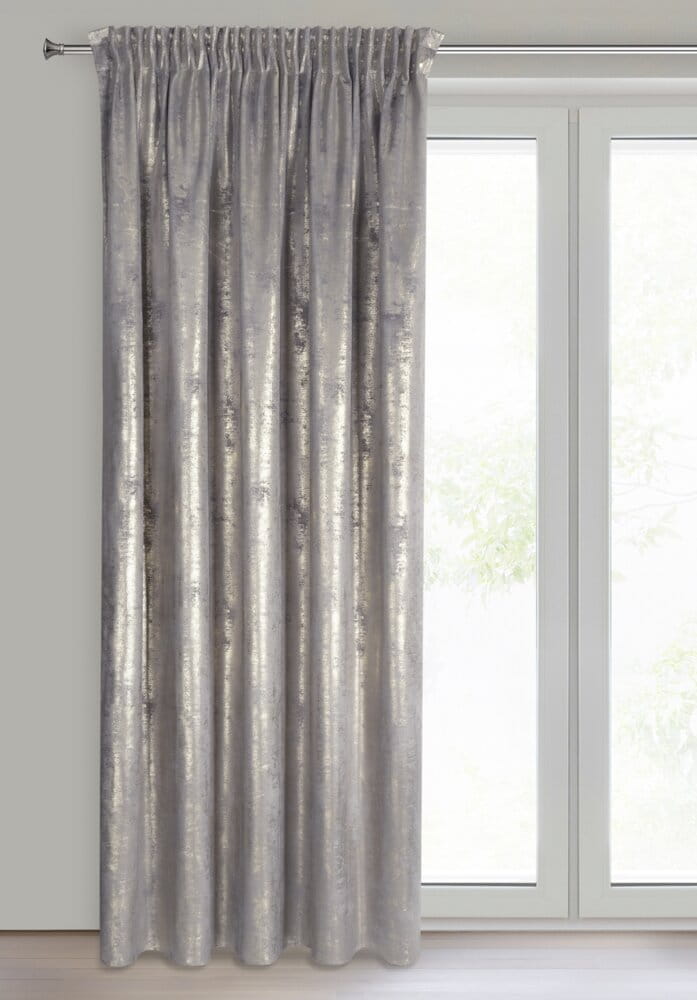 Zasłona gotowa welwetowa z błyszczącym nadrukiem szerokość: 140 cm, długość: 270 cm, kolor: stalowy, Gramatura: 200 GSM, Skład: 100% poliester