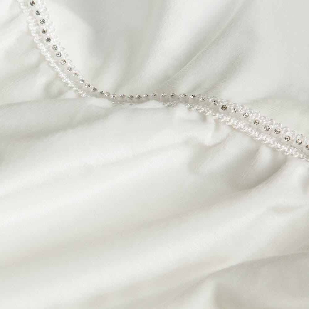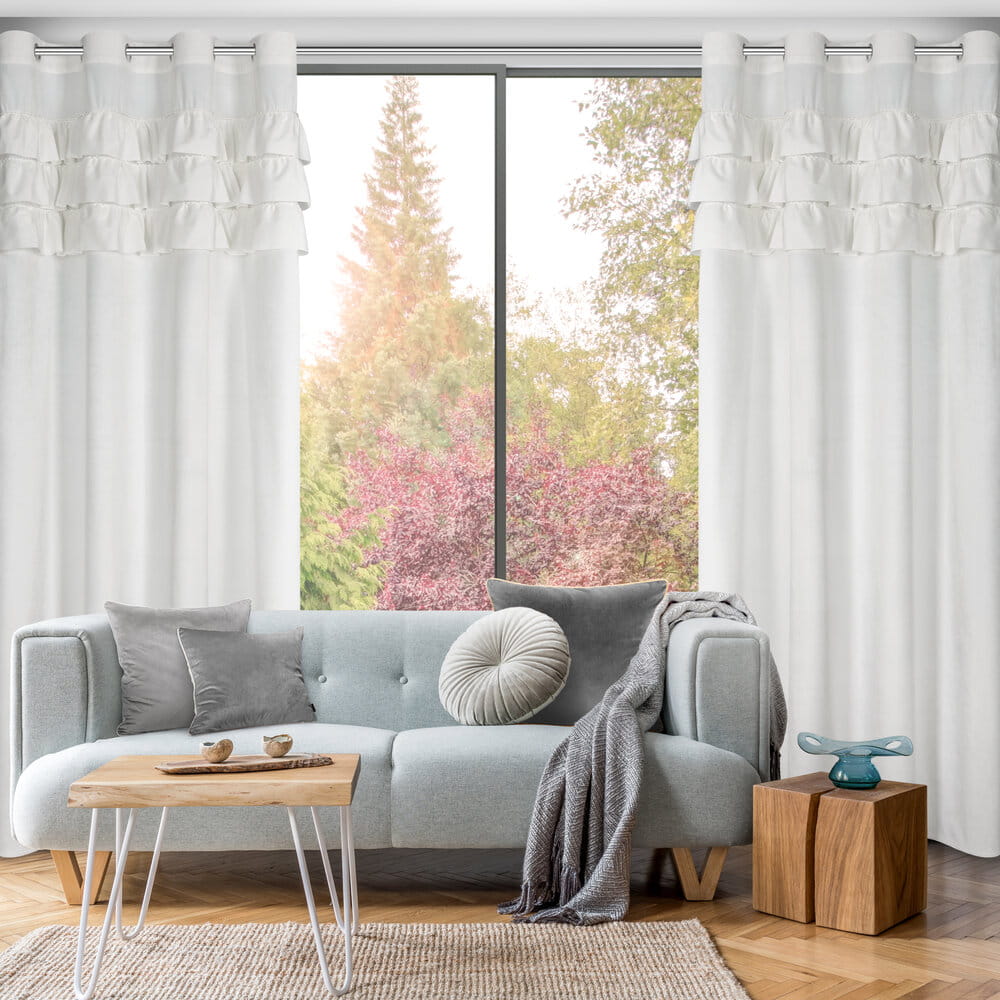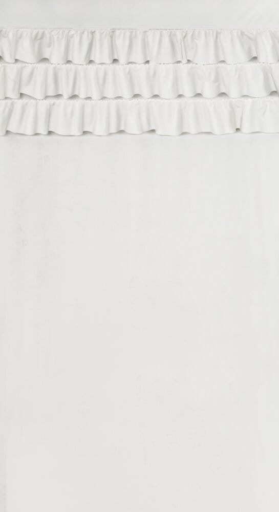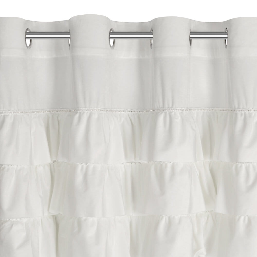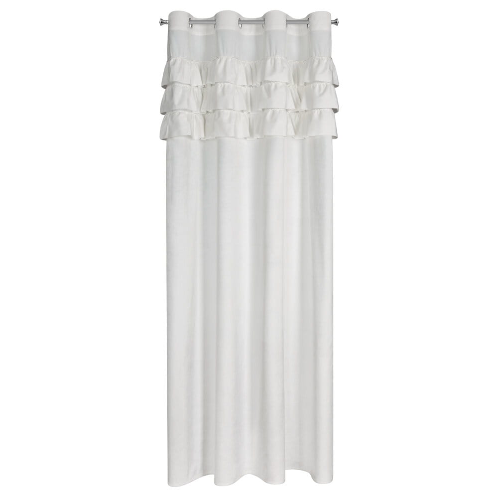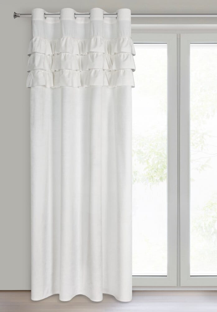 Zasłona gotowa zdobiona w górnej części falbanami i taśmą z cyrkoniami szerokość: 140 cm, długość: 250 cm, kolor: biały, Gramatura: 200 GSM, Skład: 100% poliester