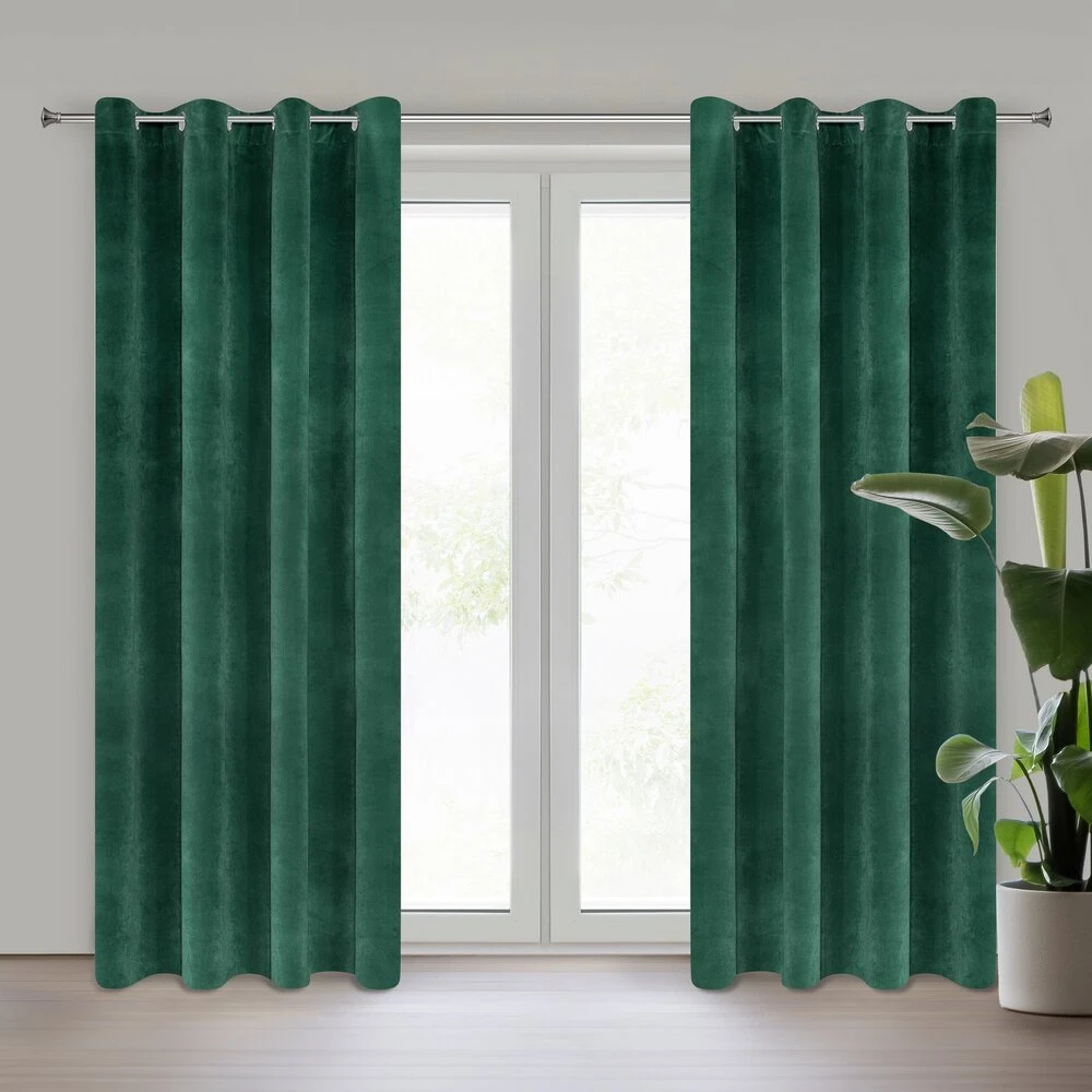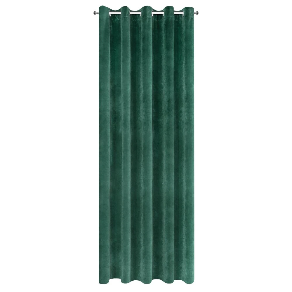 Gładka, jednokolorowa zasłona z miękkiego welwetu o charakterystycznym dla aksamitu połysku. Aż 10 szerokich przelotek umożliwia proste upięcie dekoracji okna. szerokość: 140 cm, długość: 250 cm, kolor: ciemnozielony, Gramatura: 290 GSM, Skład: 100% poliester