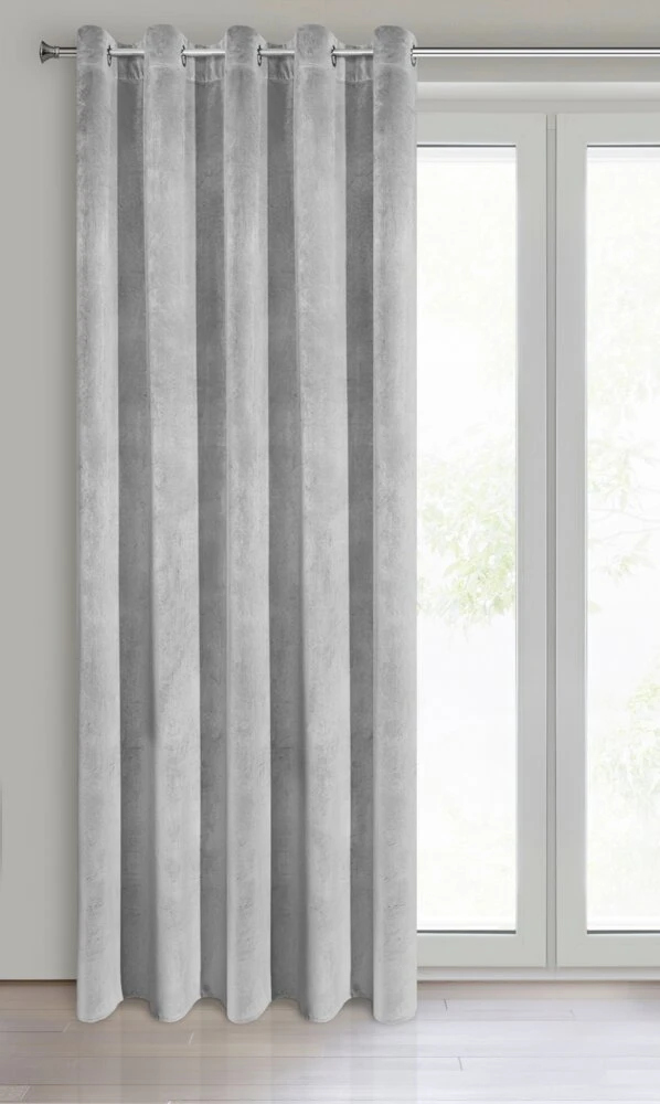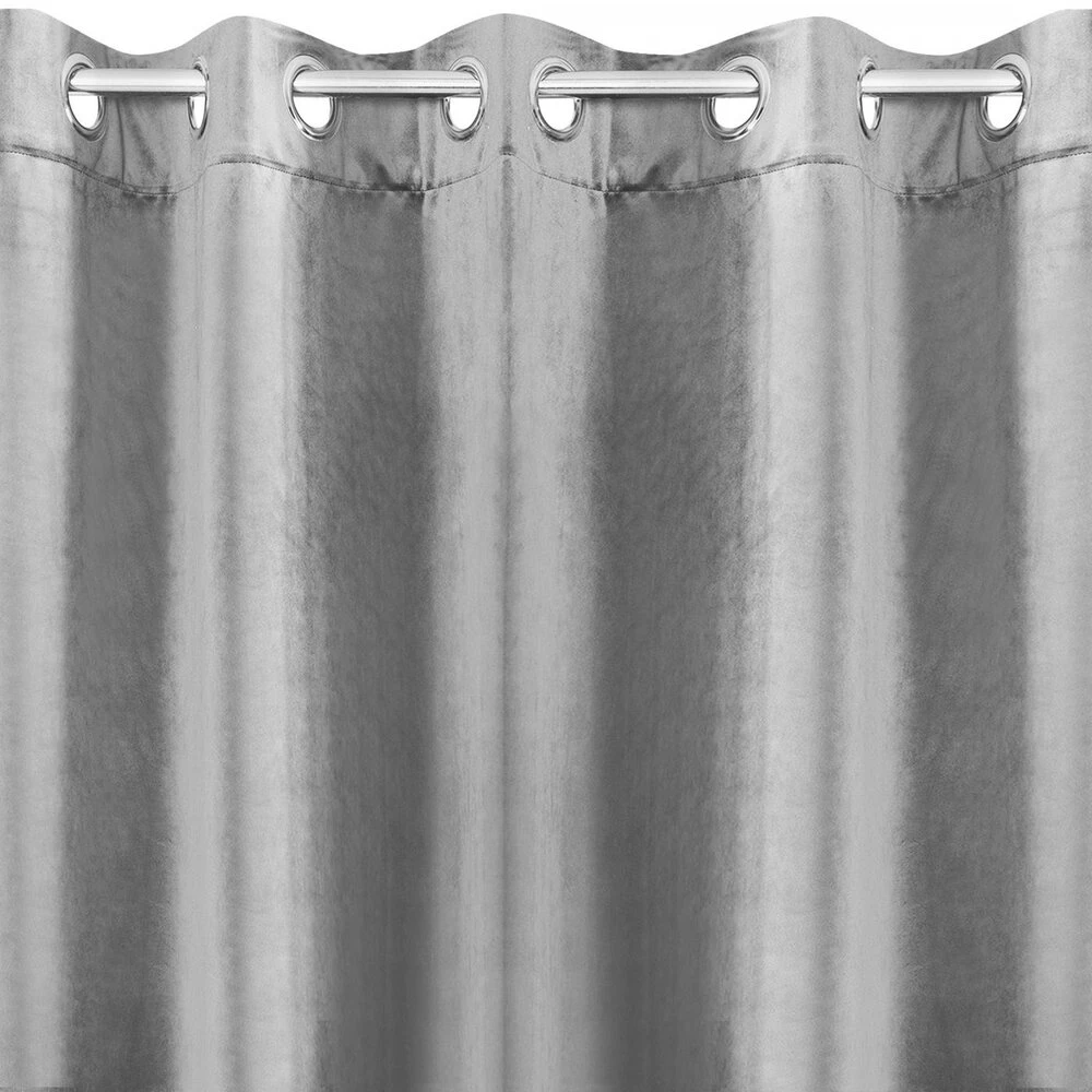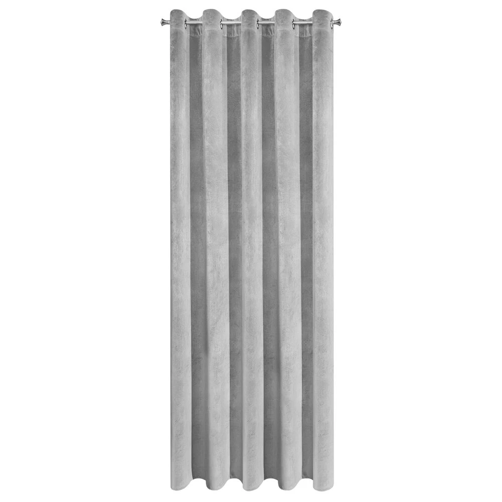 Gładka, jednokolorowa zasłona z miękkiego welwetu o charakterystycznym dla aksamitu połysku. Aż 10 szerokich przelotek umożliwia proste upięcie dekoracji okna. szerokość: 140 cm, długość: 250 cm, kolor: stalowy, Gramatura: 290 GSM, Skład: 100% poliester