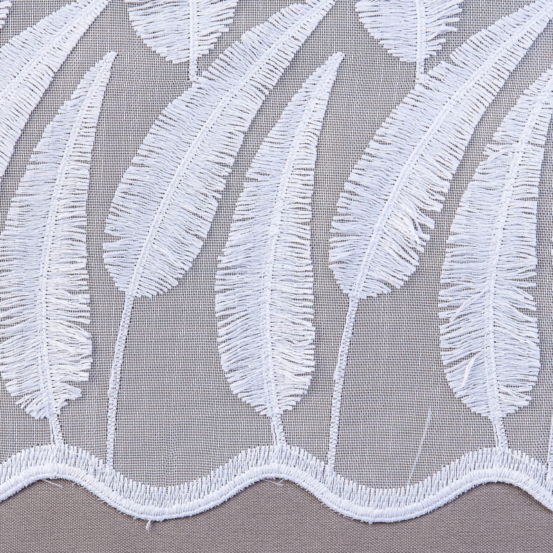 Firana została wykonana na białym, delikatnym podkładzie siateczkowym, który naturalnie przepuszcza światło, rozjaśnia pomieszczenie i tworzy efekt miękkiej, eleganckiej mgiełki w oknie. Haft występuje w dwóch wariantach kolorystycznych: