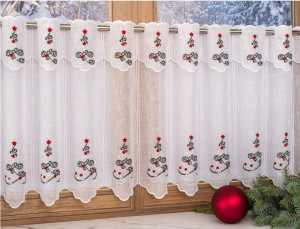 Nadaj swojemu wnętrzu wyjątkowego klimatu świąt dzięki eleganckiej zazdrostce z motywem choinek haftowanych w biało-zielono-czerwone wzory. To połączenie subtelnej bieli z kolorowymi detalami sprawia, że firanka pięknie rozświetla wnętrze i tworzy przytulną, radosną atmosferę w domu.